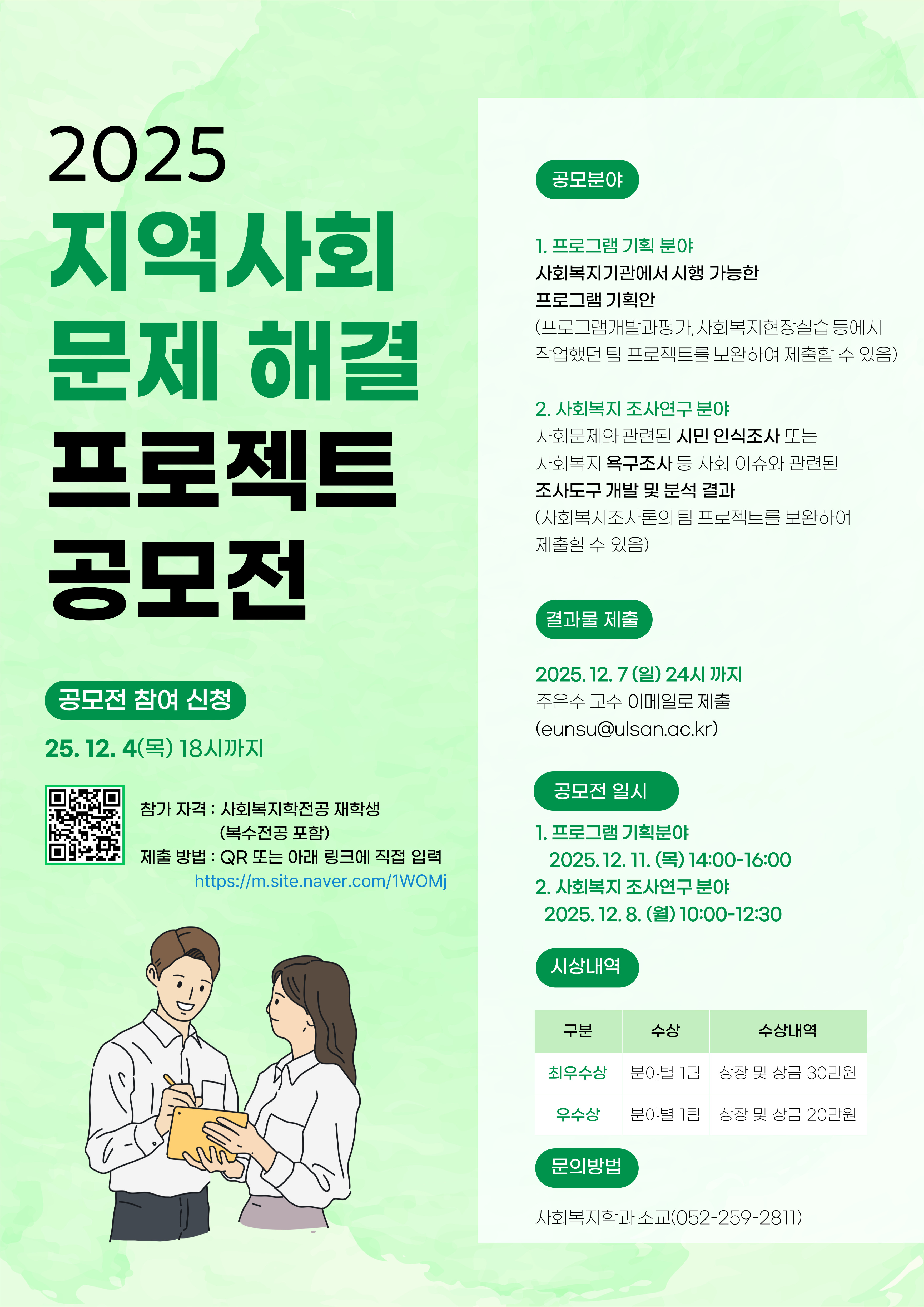 [2025 지역사회 문제해결 프로젝트 공모전] 1.공모 분야 -프로그램 기회분야 -사회복지 조사연구 분야 2.참가 자격 사회복지학전공 재학생(복수전공 포함) 3.신청 방법 포스터 QR 또는 https://m.site.naver.com/1WOMj 로 신청 4.결과물 제출 -25.12.07(일) 24시까지 5.공모전 일시 및 장소 -프로그램 기획분야 : 12.11(목) 14시-16시 사회복지현장실습 수업과 연계하여 진행