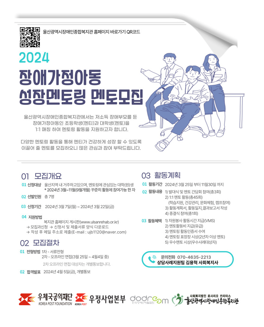 우체국공익재단은 공익사업의 전문성과 효율성, 지속가능성 증대를 위해 우정사업본부가 설립한 재단법인으로 우체국예금과 우체국보험의 재원을 활용하여 아동·노인·장애인 등 6만여명에게 매년 70억원 규모의 공익사업을 추진하고 있습니다. 울산광역시장애인종합복지관에서는 우정사업본부 및 우체국공익재단의 지원으로 한국장애인재활협회를 통해 시행되는 장애가정아동 성장멘토링 사업에 저소득 장애부모를 둔 장애가정아동인 초등학생(멘티)과 대학생(멘토)을 1:1매칭하여 멘티가 건강하게 성장 할 수 있도록 지원하고자 합니다. 이에 2024년 장애가정아동 성장멘토링 사업에 함께 참여할 멘토를 모집하오니, 관심있는 학생들의 많은 참여 부탁드립니다. [모집개요] 1. 신청대상 : 울산지역에 거주하며 멘토링에 관심있는 대학(원)생 2. 선발인원 : 7명 3. 신청기간 : 2024년 3월 4일(월) ~ 3월 22일(금) 4. 지원방법 : 복지관홈페이지게시판 (www.ulsanrehab.or.kr) →모집과신청→신청서 및 제출서류 양식 다운로드→작성 후 메일 주소로 제출(ujb1120@naver.com) [모집절차] 1. 전형방법 : 1차 - 서류전형 / 2차 - 오프라인면접 (3. 18.(월) ~ 3. 22.(금)) 2. 합격발표 : 2024. 3. 22.(금) / 개별통보 [활동계획] 1. 활동기간 : 2024. 3. 25.(월) ~ 2024. 11. 30.(토) 2. 활동내역 - 발대식 및 멘토간담회 참여(3회) - 1:1 멘토 활동(45회) (학습지원, 건강관리, 문화체험, 캠프 등) - 활동계획서, 활동일지, 결과보고 작성 - 종결식참여 (1회) [지원 혜택] - 자원봉사활동시간 지급(VMS) - 멘토활동비 지급(유급/1회3만원) - 멘토링 활동인증서 수여 - 멘토링 표창장 시상(2년차 이상 멘토) - 우수멘토 시상(우수사례대상자)