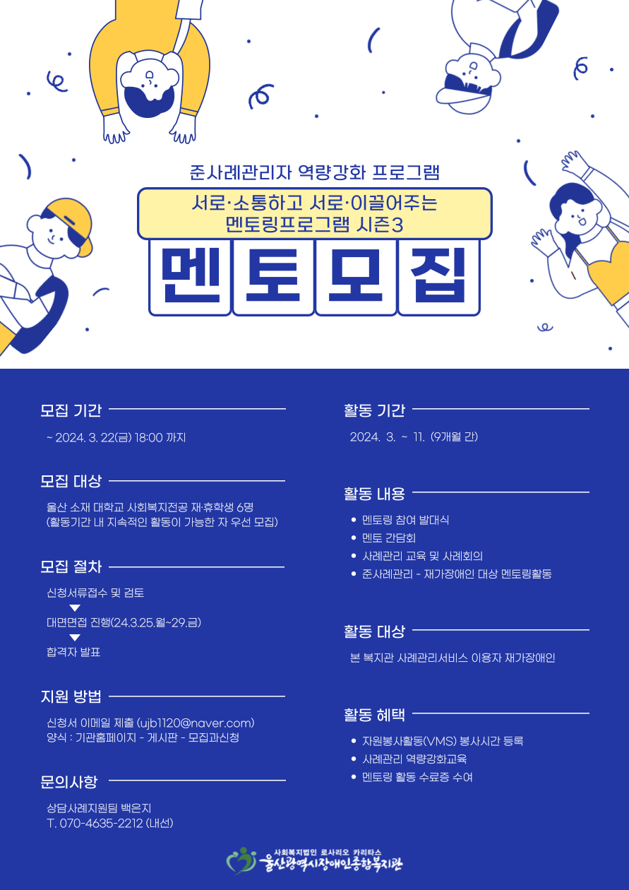 울산광역시 장애인종합복지관은 울산광역시사회복지협의회의 지원을 받아 '사회적고립'을 겪고 있는 재가장애인의 정서지원을 위해 준사례관리자와 함께하는 「서로·소통하며 서로·이끌어주는 멘토링프로그램」 시즌3'을 진행하고자 합니다. 이에, 멘토링프로그램에 참여하여 준사례관리자로서 역량을 강화할 멘토를 모집하오니, 관심있는 학생들의 많은 참여 바랍니다. 1. 모집기간 : ~ 24. 3. 22.(금) 18:00까지 2. 모집대상 : 울산 소재 대학교 사회복지전공 재·휴학생 3. 지원방법 : 이메일접수(ujb1120@naver.com) (홈페이지 양식 사용) 4. 활동기간 : 2024. 3. ~ 11. (9개월간) 5. 활동내용 : 발대식, 멘토간담회, 사례관리교육 및 사례회의, 재가장애인대상 멘토링활동 6. 활동혜택 : 자원봉사활동 봉사시간(VMS), 사례관리 역량강화교유그, 멘토링활동 수료증 수여 7. 문의 : 상담사례지원팀 사회복지사 백은지 TEL. 070-4653-2212(내선)