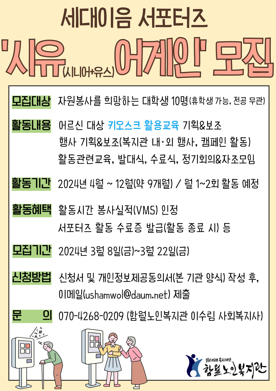 함월노인복지관에서 어르신 대상 키오스크 활용교육 기획&보조, 행사 기획&보조(복지관 내·외 행사, 캠페인 활동 등 자원봉사를 희망하는 대학생 10명을 모집중에 있습니다. 아래 포스터를 확인하여, 관심있는 많은 학생들의 지원 바랍니다.