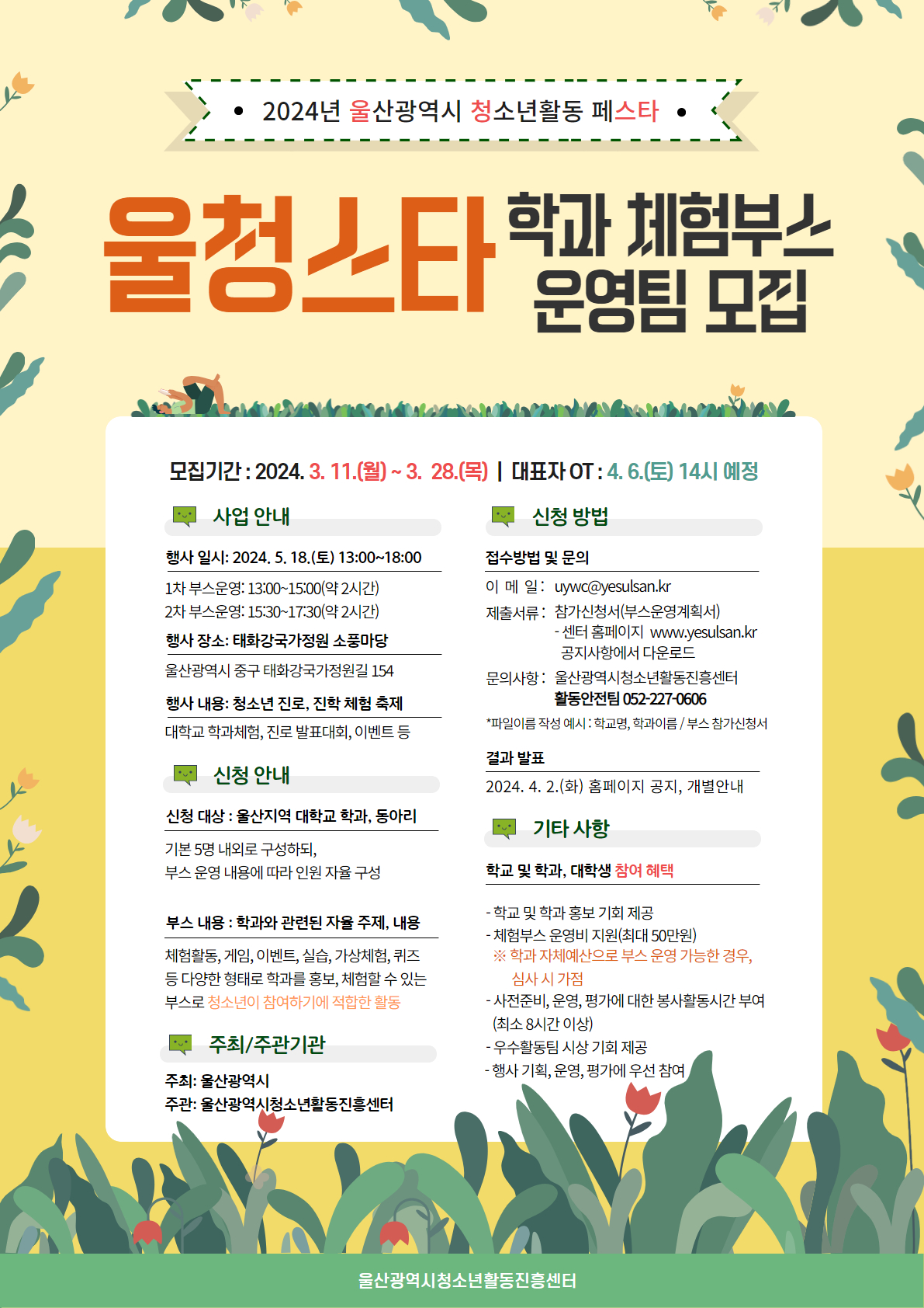 | 「2024년 울산광역시 청소년활동 페스타」학과체험 부스 운영팀 모집 | |||||