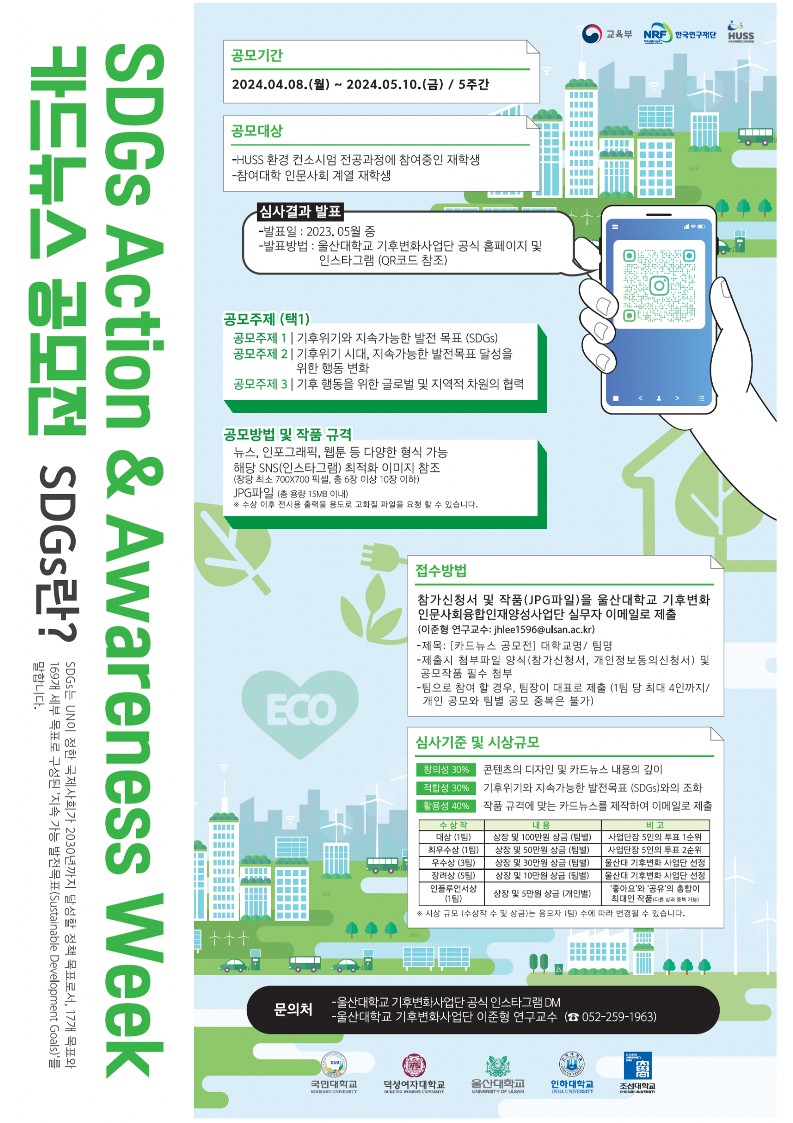 - 울산대학교 기후변화인문사회융합인재양성사업단에서는 2024 SDGs Action & Awareness Week 공모전을 아래와 같이 진행하고자 합니다.-
