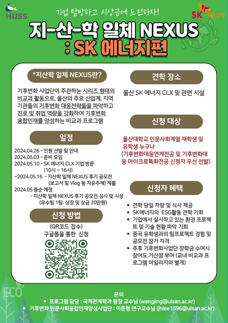 기후변화시대, 지구를 위한 새로운 도전! 울산대학교 기후변화 인문사회융합인재양성사업단에서 준비한 지산학(地産學) 일체 NEXSUS (SK 에너지편)에 참여할 여러분을 모집합니다!