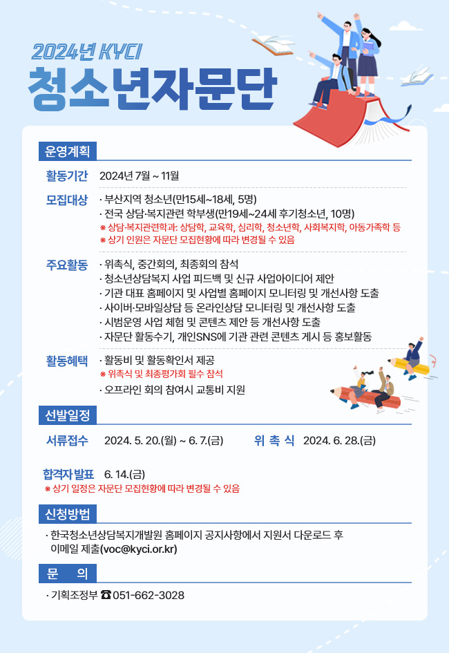 한국청소년상담복지개발원은 여성가족부 산하 공공기관으로 청소년의 건강한 성장을 위해 청소년상담복지 인력 양성 및 교육, 전문상담서비스 제공 등의 다양한 사업을 수행하고 있습니다. 한국청소년상담복지개발원에서는 청소년의 눈높이에 맞게 사업 서비스를 개선하기 위해 2024년도 청소년자문단을 모집하오니 많은 관심과 참여 독려 부탁드립니다. 가. 2024년 청소년자문단 모집 개요 1) 활동기간 : 2024년 7월 ~ 11월 2) 모집대상 : 부산지역 청소년 및 전국 상담복지관련 학부생 3) 모집인원 : 15명 4) 주요활동 - 청소년상담복지 사업 피드백 및 신규 사업아이디어 제안 - 홈페이지 등 온라인 매체 모니터링 및 개선사항 도출 - 청소년사이버상담 서비스 체험 및 개선사항 도출 등 나. 활동 혜택 - 위촉식 및 중간회의·최종평가회 참여 시, 교통비 지급 - 활동비 및 활동확인서 제공 다. 모집기간 : 2024년 6월 7일(금)까지 - 신청방법 : 첨부된 모집안내의 지원신청서 및 자기소개서 다운 후 이메일 제출(voc@kyci.or.kr)