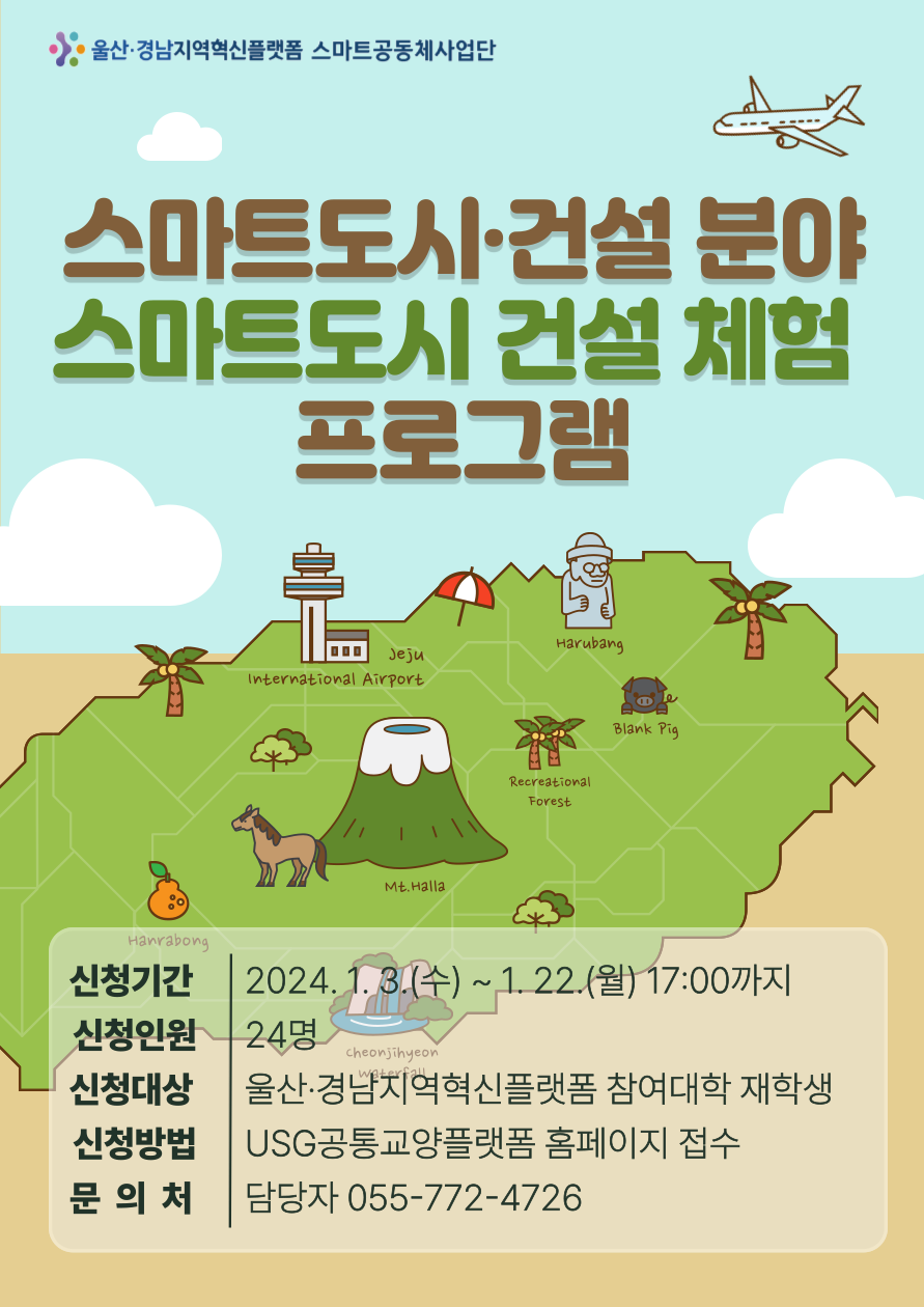 울산·경남지역혁신플랫폼 스마트공동체사업단에서는 공공기관 및 산업체 맞춤형 직무역량 강화 프로그램 운영 추진에 따른 「스마트도시·건설 분야 스마트도시 건설 체험」 프로그램을 다음과 같이 모집하오니 관심있는 학생들이 참여할 수 있도록 안내하여 주시기 바랍니다. 가. 과제명 : 공공기관 및 산업체 맞춤형 직무역량 강화 프로그램 운영(연구책임자 : 이흥규) 나. 프로그램 개요 1) 건명 : 스마트도시·건설 분야 스마트 도시 건설 체험 2) 추진목적 : 스마트도시·건설 분야 활용 최신 실무 기술 및 다양한 사례 교육을 통해 교과목 이해도 향상 및 학습동기 부여 3) 교육대상 : 울산·경남지역혁신플랫폼 참여대학 재학생 4) 일자 : 2024. 10. 10.(목) ~ 2024. 10. 12.(토) 2박 3일간 5) 장소 : 제주 일원 6) 세부일정 : [붙임1 참조] 다. 신청방법 및 선발방법 1) 신청기간 : ~ 2024. 8.14.(수) 16:00까지 2) 모집인원 : 24명 이내 3) 제출서류 : [붙임1] 체험 신청서 1부 4) 제출방법 : USG공통교양플랫폼 홈페이지 접수 (https://eclass.usg.ac.kr/courses/665e87ffe67c02728779ab24)