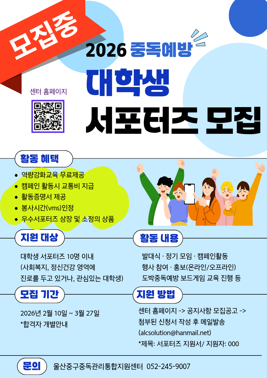 울산중구중독관리통합시원센터 [도박 회복] 서포터즈 모집