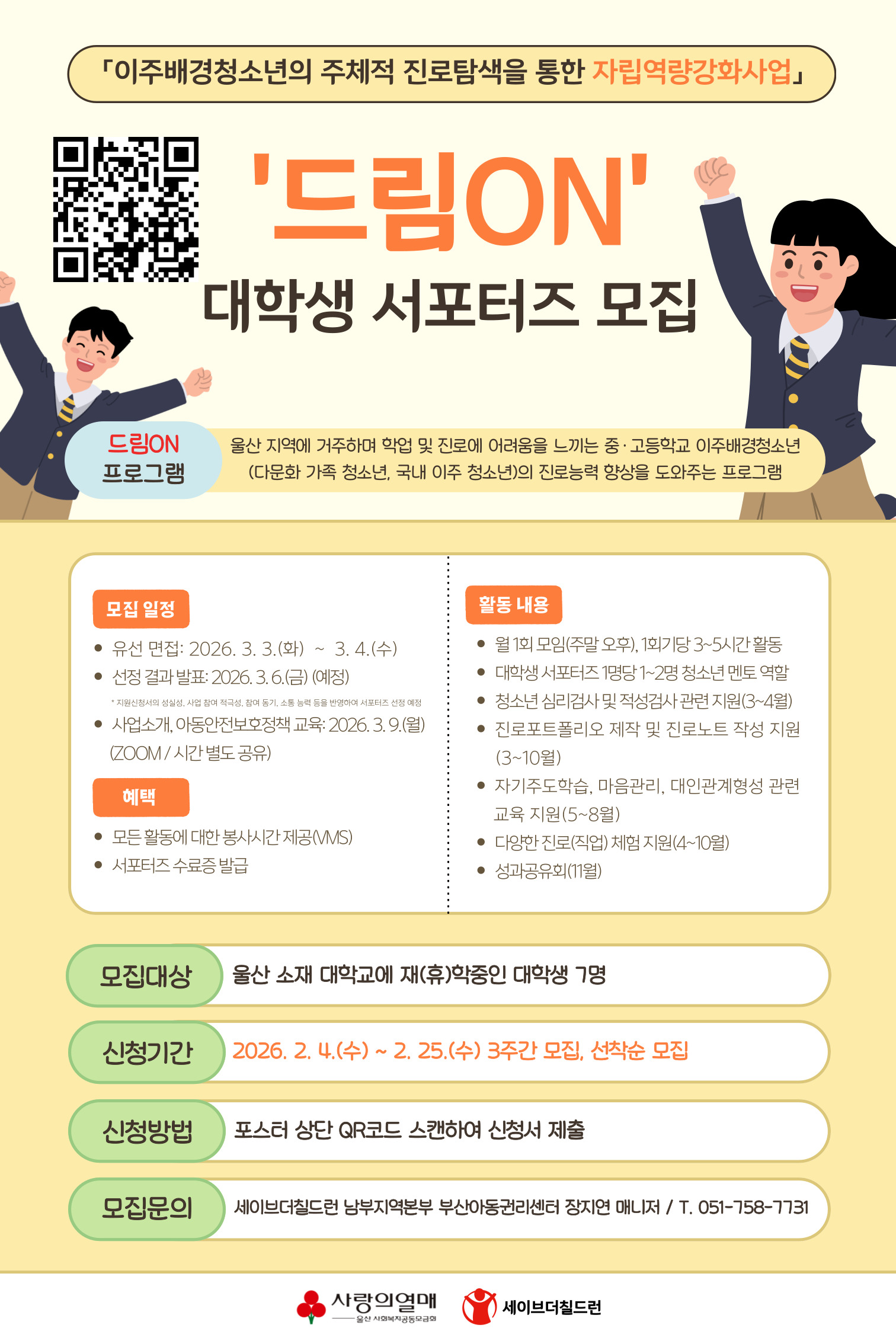 6. 제출방법: - 포스터 내 참가신청 QR코드 또는 구글폼 주소(https://forms.gle/qLhP1vehckU3AWp79)로 접속 - 구글 설문폼으로 신청서 제출 7. 혜택: - 모든 활동에 대한 봉사시간 제공(VMS) - 서포터즈 수료증 발급 8. 문의: 세이브더칠드런 장지연 매니저(jiiyeon.jang@sc.or.kr / 070-7179-1555) |