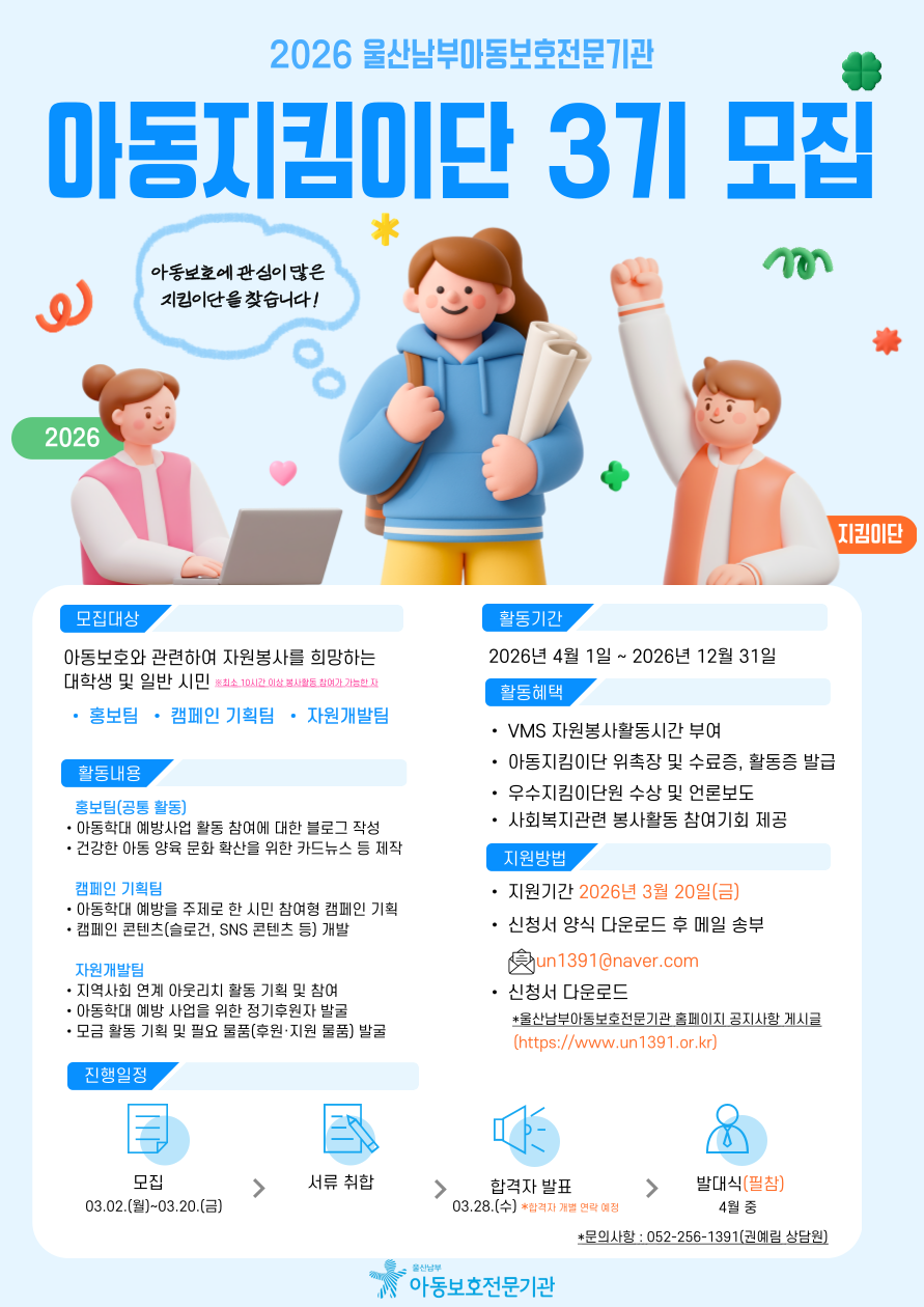 1. 모집명: 2026년 아동지킴이단 3기 2. 대상: 아동학대와 관련하여 자원봉사를 희망하는 울산 내 대학생 및 일반시민 3. 신청방법: 신청서 작성 후 기관 메일 전송(un1391@naver.com) 4. 접수기간: 2026. 3. 20일(금)까지