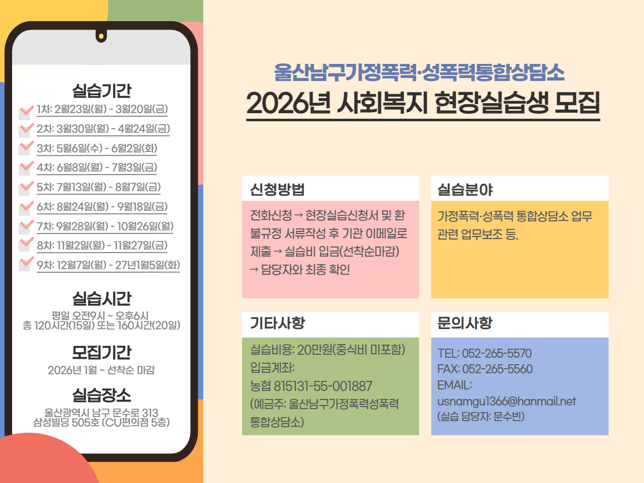 [2026년 사회복지실습생 모집 안내] 1.실습기간: 2026. 2. 23.(월) ~ 2027. 1. 5.(화) ♥ 1차 : 2월 23일(월)~ 3월 20일(금) ♥ ♥ 3차 : 5월 6일(수)~ 6월 2일(화) ♥ 4차 : 6월 8일(월)~ 7월 3일(금) ♥ 5차 : 7월 13일(월)~ 8월 7일(금) ♥ 6차 : 8월 24일(월)~ 9월 18일(금) ♥ 7차 : 9월 28일(월)~ 10월 26일(월) ♥ 8차 : 11월 2일(월)~ 11월 27일(금) ♥ 9차 : 12월 7일(월)~ 2027년 1월 5일(화) 2.모집대상: 사회복지 현장실습 대상자 3.실습분야: 울산남구가정폭력·성폭력통합상담소 상담소 보조업무 4.신청방법: 전화신청 052-265-5570 (사회복지실습담당자) 5.기타사항 가. 실습시간 : 9:00~18:00 / 120시간(15일) 또는 160시간(20일) 나. 실습비 : 20만원 (중식비 미포함) 다. 실습장소 : 울산광역시 남구 문수로 313, 삼성빌딩 505호 라. 입금계좌 : 농협 815131-55-001887 (예금주:울산남구가정폭력성폭력통합상담소) * 첨부파일의 현장실습신청서 및 환불규정 서류 작성 → 기관 메일로 발송 → 실습비 입금 → 기관 담당자와 확인 전화 * 현장실습신청서 및 환불규정 서류에 "서명" 필수!! |